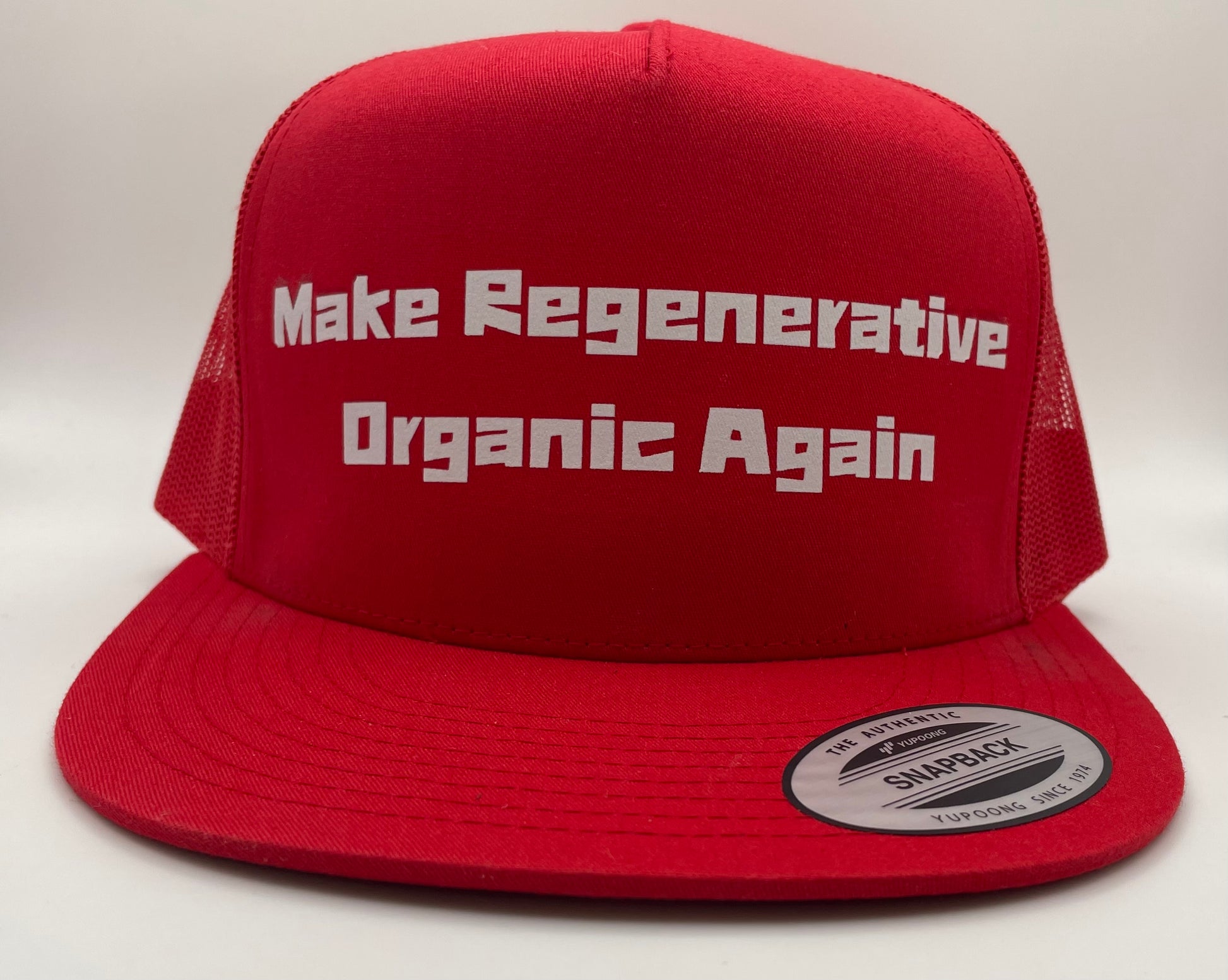So, this is why we created this hat. We want to get the message out there that regenerative should be organic – that “organic is regenerative but not all regenerative is organic” …that regenerative farming isn’t a new concept, it has actually been around for thousands of years, since long before there were toxic synthetic inputs and gmo technology. Let’s do that kind of farming again, right? Help us spread the good word – “Make Regenerative Organic Again”